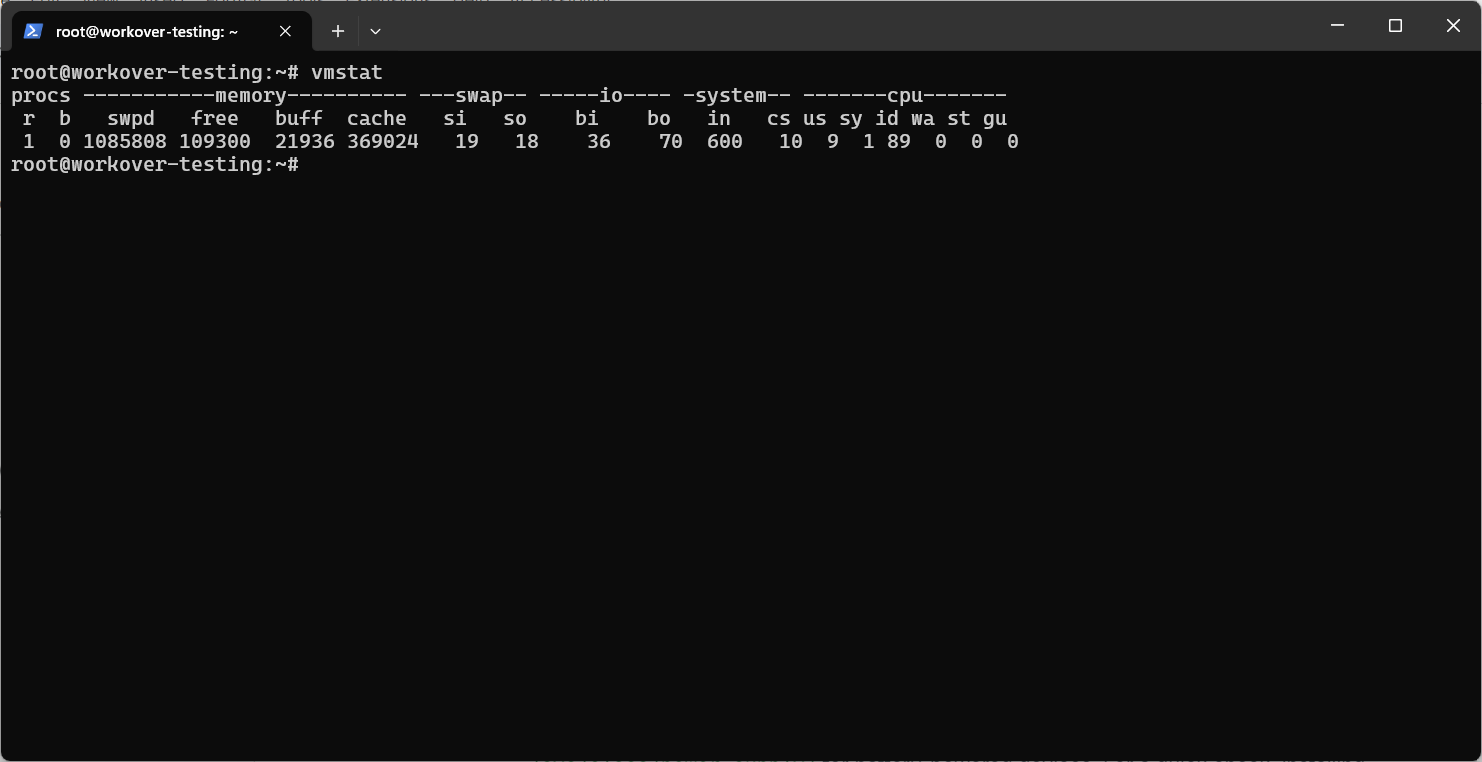 The Virtual Memory Statistics (vmstat) command offers a concise view of system performance, including CPU usage, memory, swap space, and I/O statistics. It’s especially useful for identifying bottlenecks affecting CPU performance, such as memory constraints or excessive swapping. You can use this command by executing the following code snippet in your terminal: