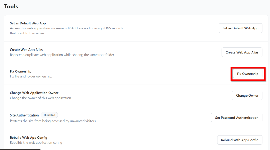 After fixing the file permissions, you can fix the file ownership issues by simply clicking the “Fix Ownership” button in the Tools menu.