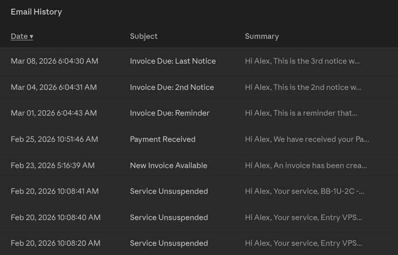 If you have trouble locating a specific email or have questions about your account notifications, our Billing team is available seven days a week from 7AM–7PM CST. You can reach them by opening a support ticket directly from the Client Portal under the Helpdesk section.
