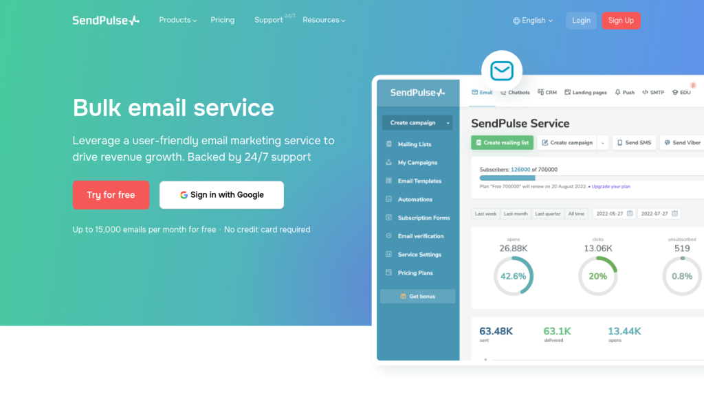 SendPulse | 15,000 FREE Emails/month + Starting at $6.40/mo |