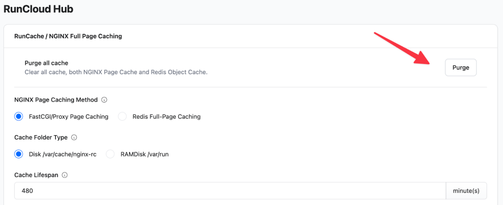 Note: If you are using RunCloud, then you don’t need to touch the command line for this. Simply log in to your RunCloud Dashboard and navigate to the RunCloud Hub settings page for your web application. On this page, click the Purge button. This clears the cached HTML immediately, even without SSH access.